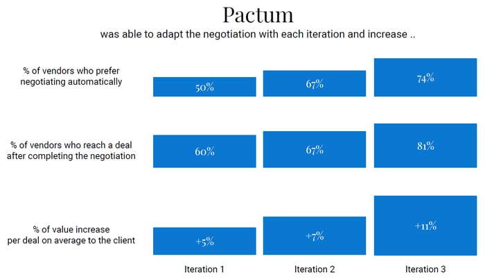First, the preference of suppliers for using Pactum over a human negotiator rose from 50 to 74%. This is because the bot simply became better at communicating and was able to provide a more hassle-free experience. In addition, the percentage of suppliers who agreed to the final deal increased from 60 to 81%. This shows how well Pactum was able to listen to what the client wanted while moving the final agreement to the Pareto optimal line.